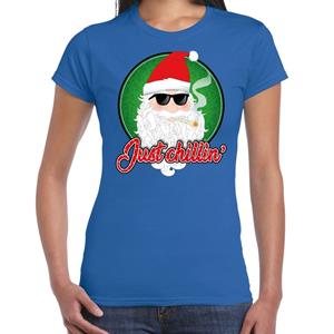 Fout Kerst T-shirt coole Santa just chillin blauw voor dames. Dit Kerst shirt / t-shirt is bedrukt met afbeelding van een coole kerstman met joint en de tekst: Just Chillin'. Dit kerstshirt / t-shirt is leuk om te dragen tijdens een kerstborrel of bij het gourmetten. Materiaal: 100% katoen, 145 grams kwaliteit.Let op: dit artikel valt klein, we adviseren om 1 maat groter te bestellen.